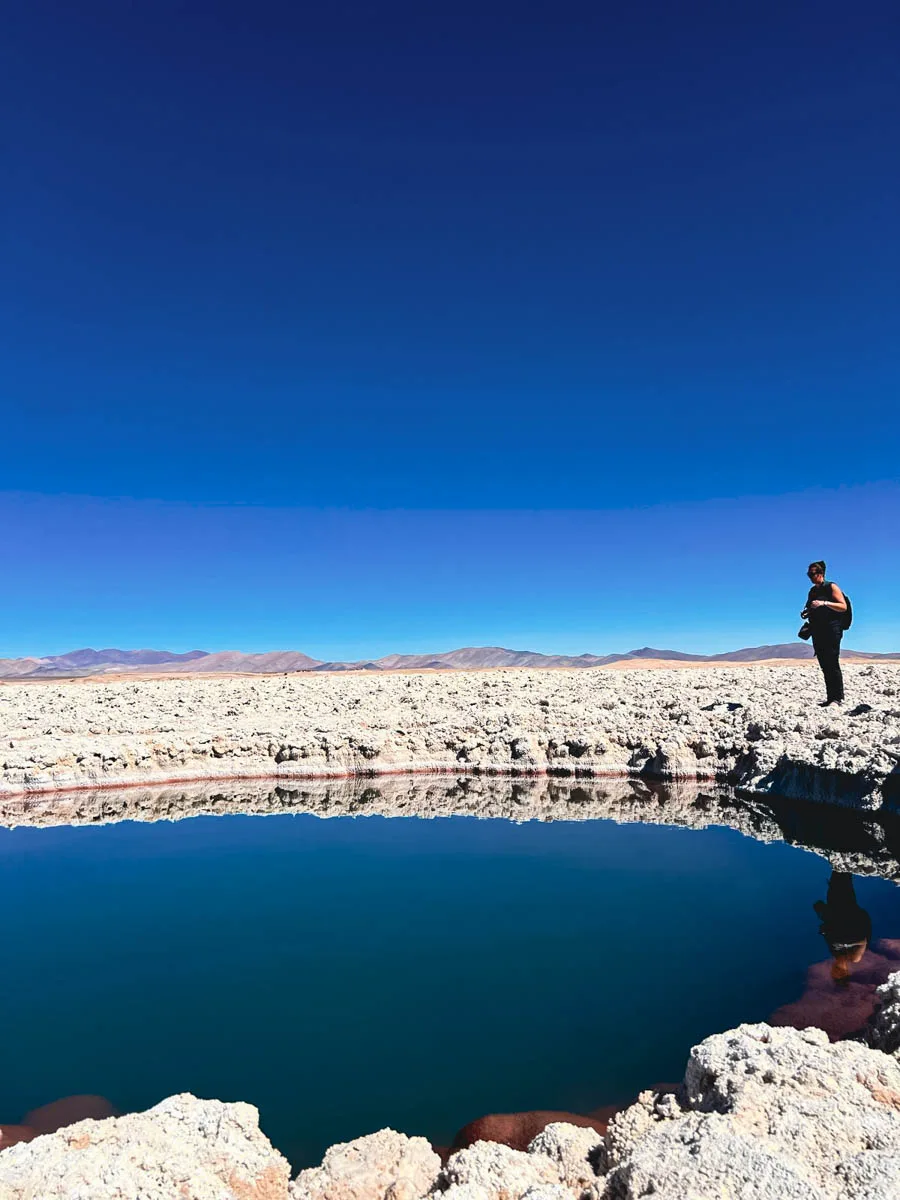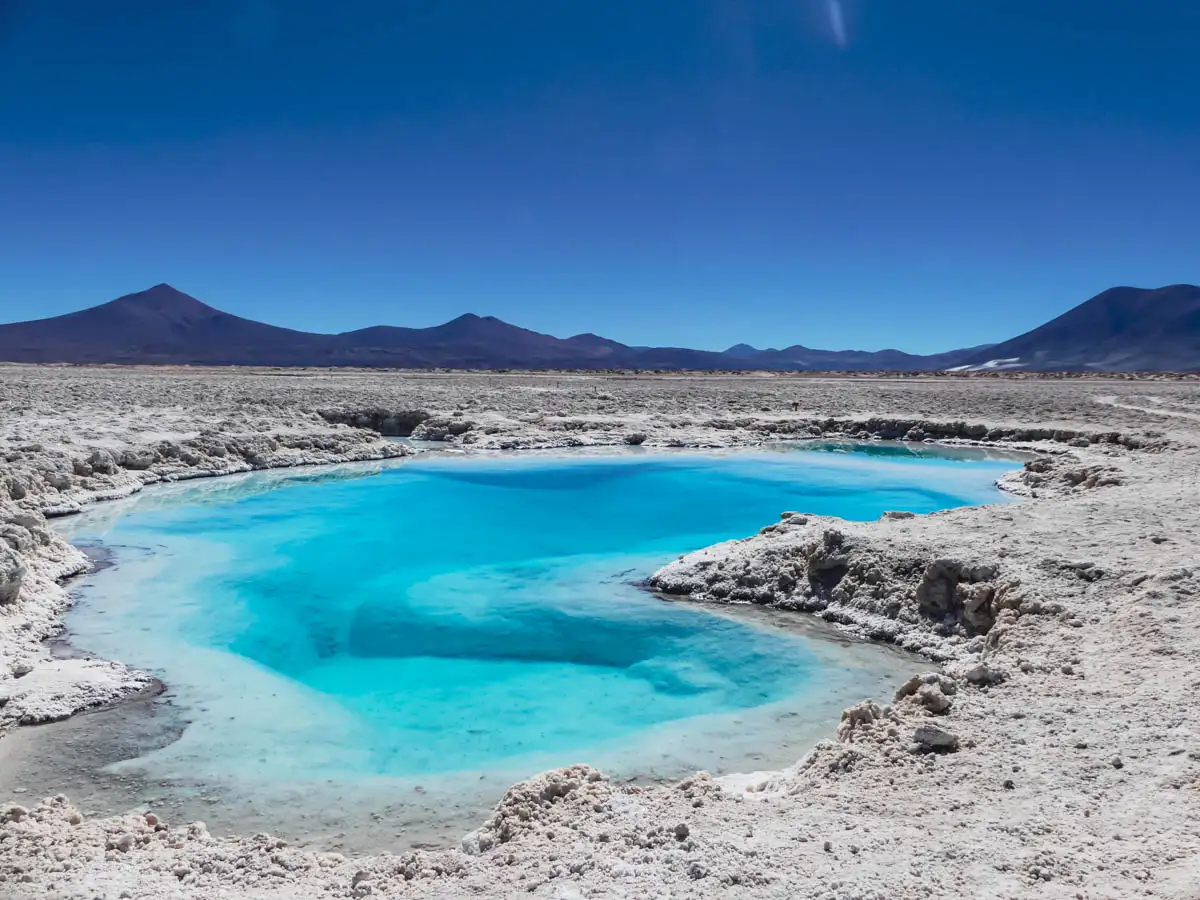 Pour notre première halte, Vanessa nous emmène au Salar de Pedernales. Dans cette immense surface de sel, nous y découvrons de magnifiques lagunes. Chacune a son charme, sa nuance de bleu, sa forme de roche et de sel.